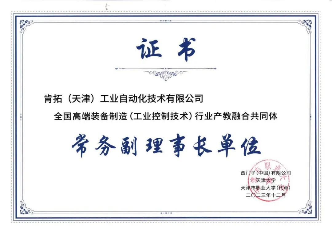 我公司當選為全國高端裝備制造(工業控制技術)行業產教融合共同體常務副理事長單位。 王旭在致辭中表示, 希望共同體發揮天津職業教育改革特色優勢,助力天津科技成果轉化,服務經濟社會發展。林宇表示,共同體的成立是天津落實現代職業教育體系建設改革新模式實施方案的具體舉措,希望共同體能夠做實做優,為全國同類共同體建設積累成功經驗。劉康表示,共同體成立對于集聚高端裝備制造行業的產教資源,促進教育鏈、人才鏈與產業鏈、創新鏈融合發展,推動以實體經濟為支撐的現代產業體系建設具有重要意義。全國高端裝備制造(工業控制技術)行業產教融合共同體是由西門子(中國)有限公司、天津大學、天津職業大學牽頭,聯合高端裝備制造行業組織、學校、科研機構、上下游企業等共同組建的實體化運營組織,旨在持續深化產教深度融合,賦能職業教育高質量發展,推動高端裝備制造產業鏈價值鏈向高端延伸。實行政府引導、市場主導、企業主體、院校支撐的運行機制,將堅持目標導向、問題導向和效果導向,夯實教產互促互助的建設內涵,通過建立完善議事協調制度,有組織開展人才培養、科技創新和社會服務,實現職業教育與產業高質量發展的雙向奔赴。